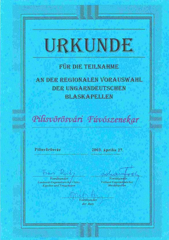 2003. április 27-én zenekarunk fúvószenekari találkozót rendezett, amely a nagymányoki Országos Fúvószenekari Fesztivál előválogatója volt. A Magyarországi Németek Ének-, Zene- és Tánckarok Országos Tanácsa háromévente rendez kultúrcsoportjainak országos fesztiválokat, és ebben az évben a felnőtt fúvószenekarok is sorra kerültek. A fesztiválokat előválogatók előzték meg a különböző régiókban. Az elhangzott produkciókat a szakemberekből álló zsűri értékelte. (2.sz. melléklet) A zsűri elnöke Apáthy Árpád karnagy, a Pécsi Liszt Ferenc Zeneiskola igazgatója volt, továbbá Piergiorgio Pisetta, zeneszerzője és trombitása az albianoi zenekarnak, Neumayer Károly, a Pécsi Tudományegyetem Zeneművészeti Intézetének Főiskolai docense, és Apaceller József, a magyarországi Német Fúvószenekari Szekció alelnöke volt a zsűri tagja. A nagymányoki döntőre négy zenekarból csak kettő jutott tovább, a vörösvári, és a budafoki.