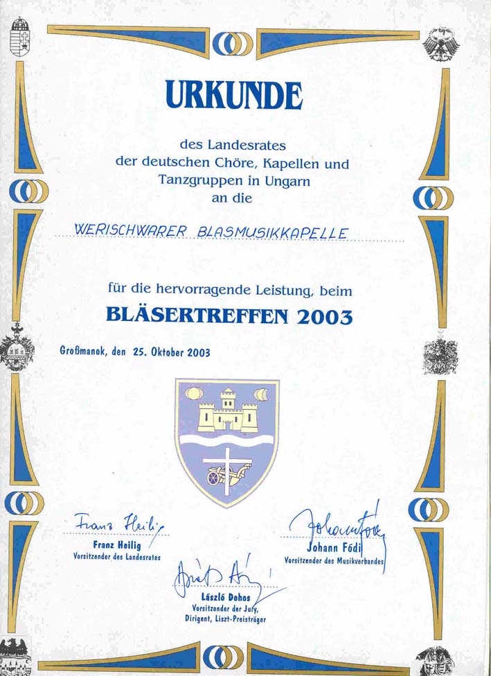 2003. október 25-én a Magyarországi Német Fúvószenekarok Országos Fesztiválján kitüntetésben: Josef-Gungl díjban részesült.