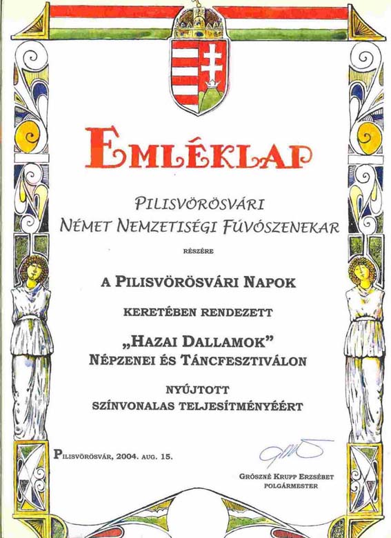 2005. október 23-án a Pilisvörösvári Német Nemzetiségi Fúvószenekar „Pilisvörösvárért” emlékérmet kapott a város kulturális életében kiemelkedően eredményes, önzetlen, áldozatos és maradandó munkájáért.