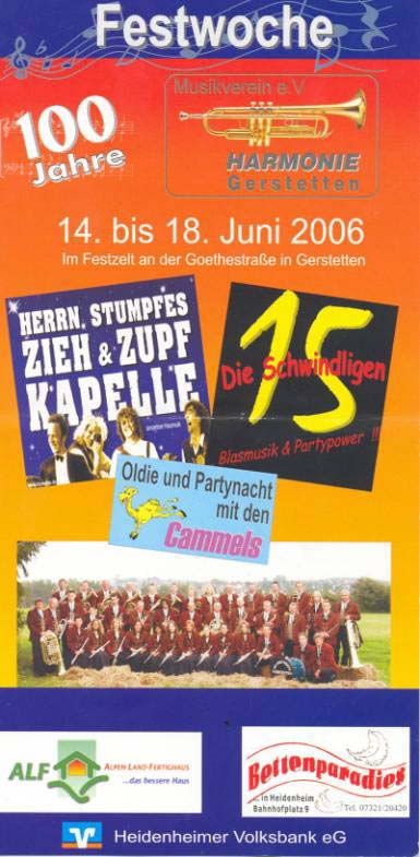 2006-ban a zenekar a kisebb fellépések mellett hivatalos Németországba, Gerstettenbe. A gerstetteni Musikverein Harmonie zenekar ugyanis idén ünnepli fennállásának 100. évfordulóját. Június 14-18-ig tart az ünnepi hét, melyre a vörösvári zenekaron kívül még 24 zenekar hivatalos. Bár az ünnepségsorozat már szerdán kezdődik, a fúvós csak pénteken utazik egy hosszú hétvégére. Itt a zenekar feladata lesz: részvétel a „Kinderfest” felvonuláson, a partnerkapcsolati ünnepélyen, reggeli ébresztő a többi zenekarral együtt, a zene szolgáltatása az evangélikus istentiszteleten, továbbá a sörsátorban napnyugtától pirkadatig húzni a talpalávalót. (8-9.sz. melléklet)